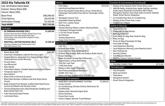 The Telluride EX is packed with premium features that elevate your driving experience. Enjoy the convenience of a Smart Key with Push-Button Start and Remote Start, as well as the added security of a comprehensive suite of advanced safety technologies, including Electronic Stability Control, Rear Cross-Traffic Alert, and Blind Spot Monitoring. The stunning LED headlamps and Gloss Black exterior accents of the Nightfall Edition Package add a bold, distinctive style to this already impressive vehicle.