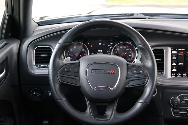 Complementing its remarkable performance, this Charger R/T Scat Pack is equipped with a wealth of premium features that elevate the driving experience. The sleek and sporty exterior is highlighted by a bold Black paint scheme and 20-inch Lo Gloss Granite Crystal alloy wheels, while the interior pampers you with heated front seats, a heated steering wheel, and a premium Uconnect 4C infotainment system with an 8.4-inch touchscreen display.