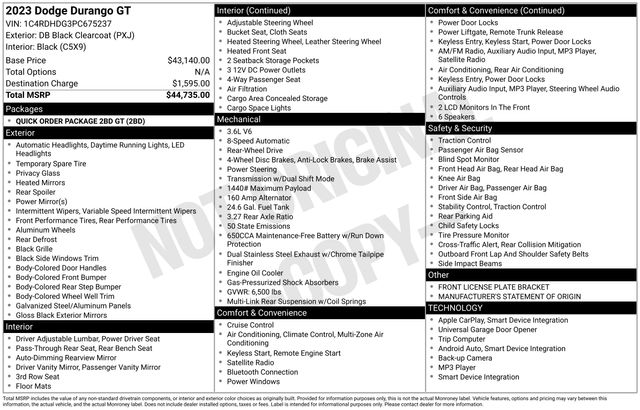 Safety is also a top priority in the Durango GT, with advanced features such as Dual Front Impact Airbags, Dual Front Side Impact Airbags, Knee Airbag, Occupant Sensing Airbag, Overhead Airbag, and Electronic Stability Control, ensuring your peace of mind on the road.