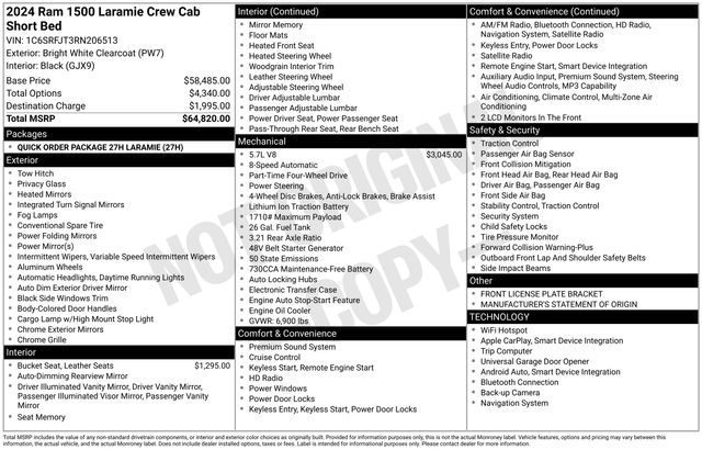 South Fork Chrysler Jeep Dodge Ram is excited to offer this gorgeous 2024 Ram 1500 in Bright White Clearcoat. This vehicle has passed our comprehensive inspection and comes with the following features: CARFAX One-Owner. *4WD, Bluetooth, Hands-Free connection, Navigation!, Backup Camera, Cruise Control, Keyless Entry, Power Locks, Power Windows, Heated Seats, Leather Seats, 10 Speakers, 4-Wheel Disc Brakes, 4G LTE Wi-Fi Hot Spot, ABS brakes, Air Conditioning, Apple CarPlay, Apple CarPlay/Android Auto, Auto-dimming Rear-View mirror, Automatic temperature control, Brake assist, Google Android Auto, GPS Navigation, Leather steering wheel, Navigation System, Outside temperature display, Overhead console, Panic alarm, ParkView Rear Back-Up Camera, Power 8-Way Driver & Passenger Seats, Power door mirrors, Power driver seat, Power steering, Power windows, Power-Folding Mirrors, Quick Order Package 27H Laramie, Security system, Speed control.