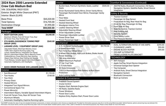 The Laramie Level 1 Equipment Group and Night Edition package elevate this Ram 2500 to new heights, offering a wealth of premium features and stylish black accents that exude confidence on the road. From the bold black exterior badging and grille to the premium leather-trimmed interior, every detail has been meticulously crafted to deliver a driving experience that is both refined and rugged.